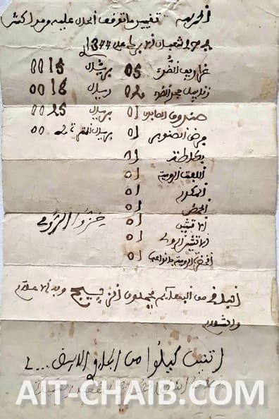Another document dated 27 Sha‘bān 1344 / March 1926 lists goods transported from Marrakech to Ouarzazate by caravans: grains, baskets, soap, pine nuts, potatoes, imported vegetables, mandarins… as well as construction materials such as zellige tiles.