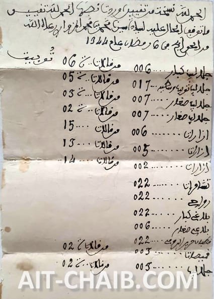 Among the local sources, a register dated 6 Ramadan 1344 / 11 March 1926, preserved at the zaouia of Sidi Othmane, records the purchases of Sidi Mohammed ben Mohammed al-Mazwar al-Glawi during the market day.