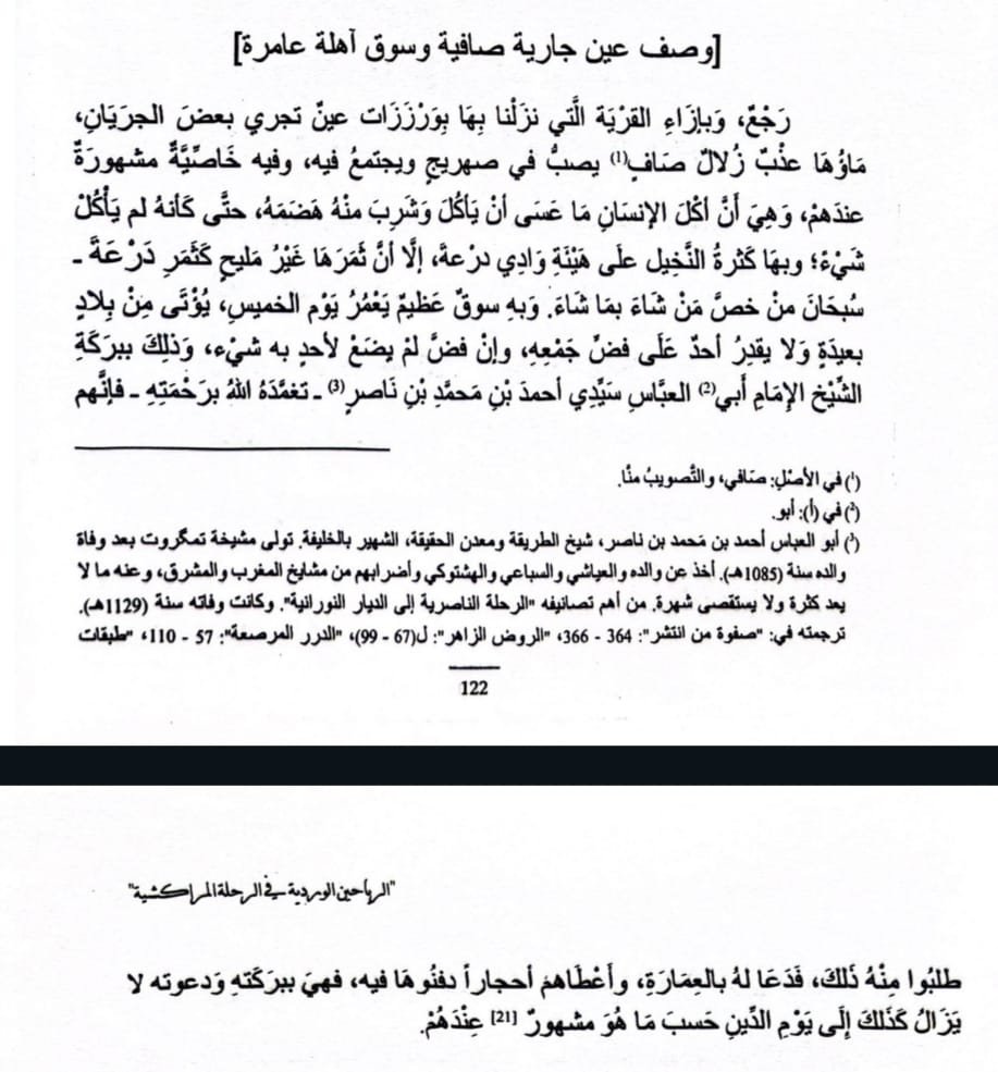 Mohammed ben Nasser ad-Dir‘i’s account in ar-Riyāhīn al-Wardiyya is one of the clearest testimonies to the existence of the Thursday market at the zaouia of Sidi Othmane and to the extent of the area known as “Warzazat” in the seventeenth century. The sheikh camped near the village and recorded a precise description of the local natural features: