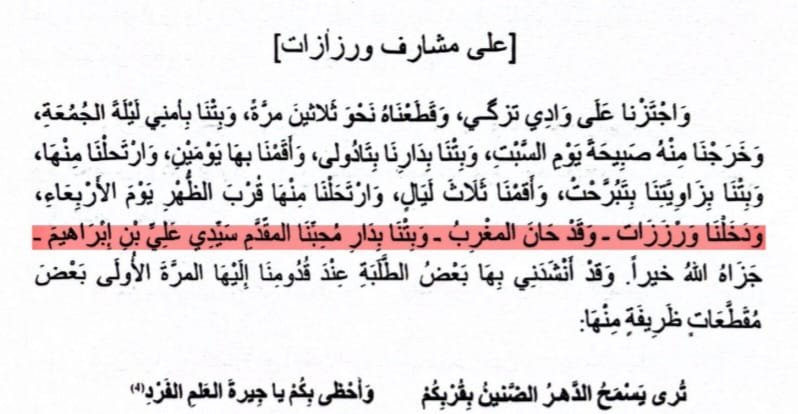 “… we entered Warzazat… and spent the night at the house of our friend, the moqaddem Sidi ‘Ali ben Ibrahim… and a student recited verses to me there…”