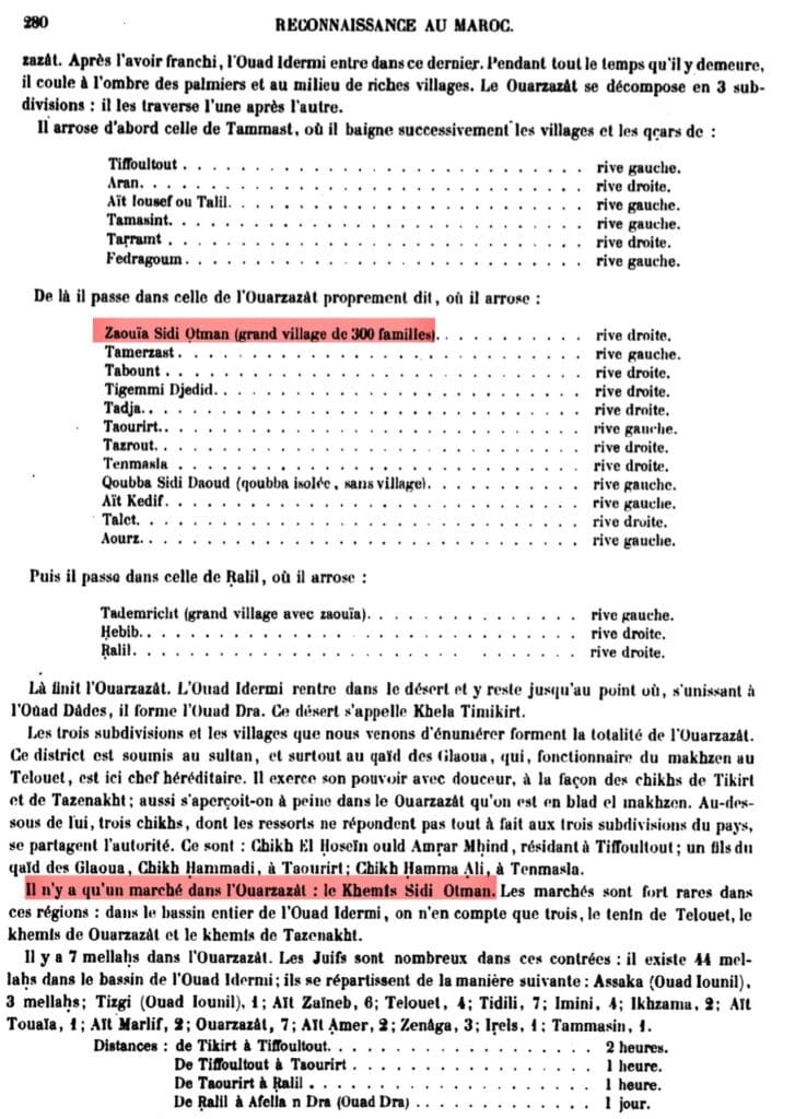 In Reconnaissance au Maroc, Charles de Foucauld provides one of the most detailed late-19th-century descriptions of the market of Sidi Othmane. His journey through the Ouarzazate basin did not lead him to a “city”—which did not yet exist—but to a broad expanse of oases and villages scattered along the riverbanks and organized around the zaouia and the weekly market.