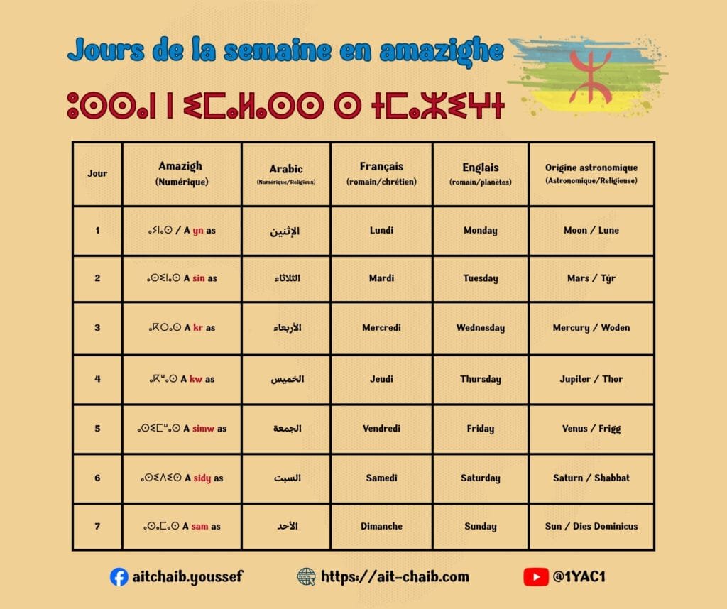 L’image jointe présente un tableau comparatif des jours de la semaine en amazigh, en arabe et dans certaines langues européennes, avec des indications sur leurs origines astronomiques ou mythologiques.